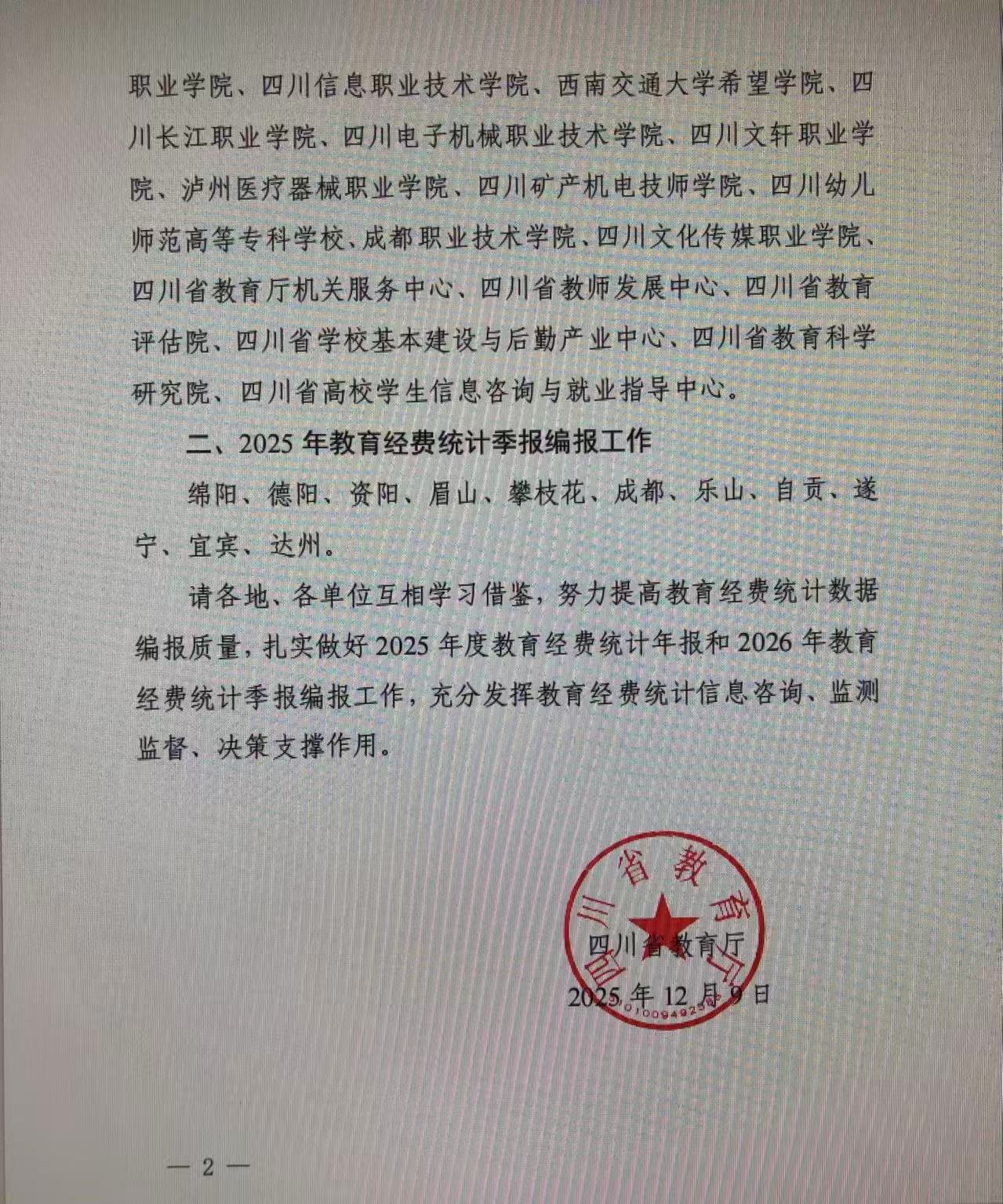 12月9日,四川省教育厅发布《关于2024年度教育经费统计年报和2025年教育经费统计季报编报工作情况的通报》,我院因在两项工作中表现突出,被予以通报表扬。